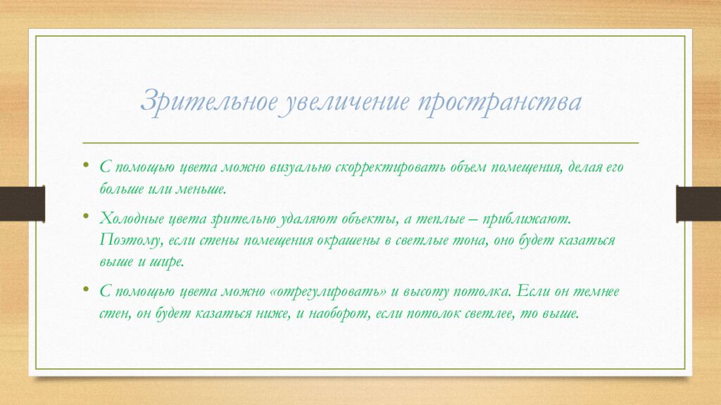 С помощью цвета можно визуально скорректировать объем помещения, делая его больше или меньше. Холодные цвета зрительно удаляют объекты, а теплые – приближают. Поэтому, если стены помещения окрашены в светлые тона, оно будет казаться выше и шире. С помощью цвета можно «отрегулировать» и высоту потолка. Если он темнее стен, он будет казаться ниже, и наоборот, если потолок светлее, то выше.