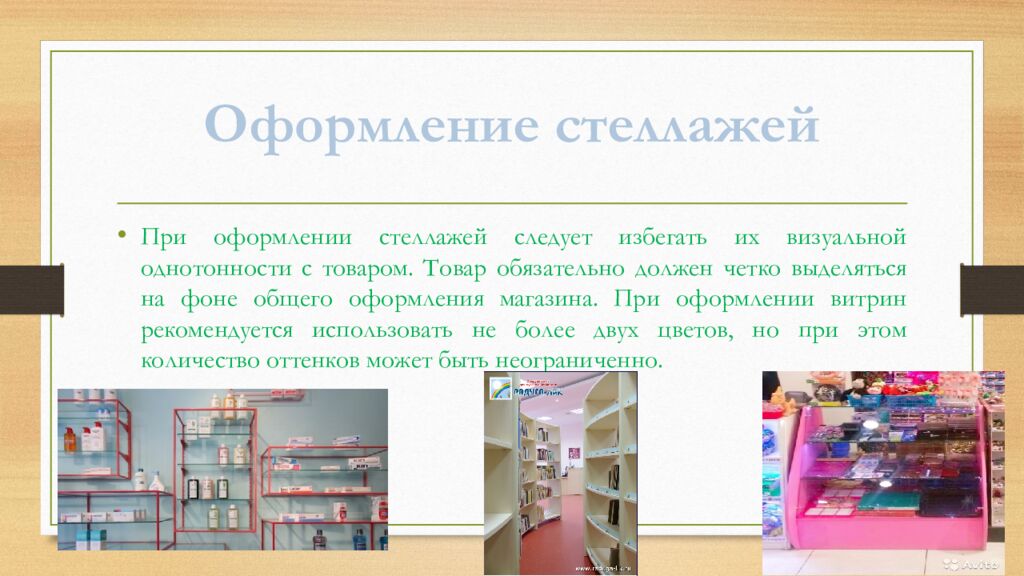 При оформлении стеллажей следует избегать их визуальной однотонности с товаром. Товар обязательно должен четко выделяться на фоне общего оформления магазина. При оформлении витрин рекомендуется использовать не более двух цветов, но при этом количество оттенков может быть неограниченно. Оформление стеллажей