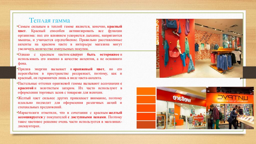 Теплая гамма Самым сильным в теплой гамме является, конечно, красный цвет. Красный способен активизировать все функции организма: под его влиянием ускоряется дыхание, напрягаются мышцы, и учащается сердцебиение. Правильно расставленные акценты на красном цвете в интерьере магазина могут увеличить количество импульсных покупок. Однако с красным цветом следует быть осторожнее и использовать его именно в качестве акцентов, а не основного фона. Прилив энергии вызывает и оранжевый цвет, но его переизбыток в пространстве раздражает, поэтому, как и красный, он гармоничен лишь в виде цвета-акцента. Пастельные оттенки оранжевой гаммы вызывают ассоциации с красотой и золотистым загаром. Их часто используют в оформлении торговых залов с товарами для женщин. Желтый цвет сильнее других привлекает внимание, поэтому идеально подходит для оформления различных акций и специальных предложений. Маркетологи отметили, что в сочетании с красным желтый ассоциируется у покупателей с доступными ценами. Поэтому такое цветовое решение очень часто используется в магазинах-дискаунтерах.