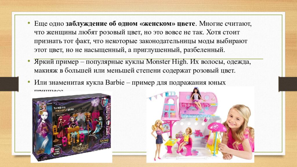Еще одно заблуждение об одном «женском» цвете. Многие считают, что женщины любят розовый цвет, но это вовсе не так. Хотя стоит признать тот факт, что некоторые законодательницы моды выбирают этот цвет, но не насыщенный, а приглушенный, разбеленный. Яркий пример – популярные куклы Monster High. Их волосы, одежда, макияж в большей или меньшей степени содержат розовый цвет. Или знаменитая кукла Barbie – пример для подражания юных принцесс.