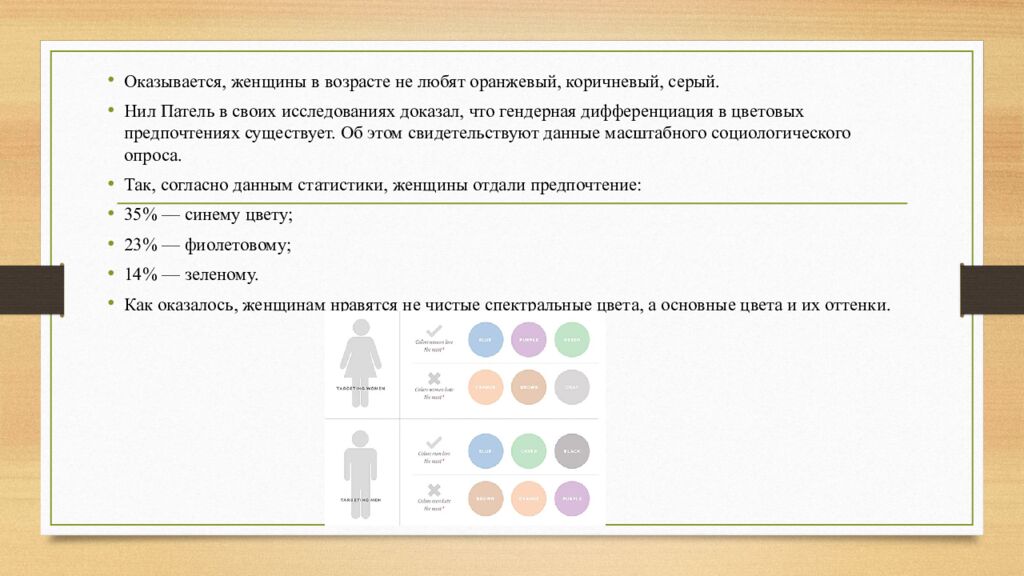 Оказывается, женщины в возрасте не любят оранжевый, коричневый, серый. Нил Патель в своих исследованиях доказал, что гендерная дифференциация в цветовых предпочтениях существует. Об этом свидетельствуют данные масштабного социологического опроса. Так, согласно данным статистики, женщины отдали предпочтение: 35% — синему цвету; 23% — фиолетовому; 14% — зеленому. Как оказалось, женщинам нравятся не чистые спектральные цвета, а основные цвета и их оттенки.