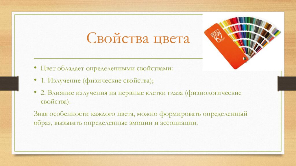 Цвет обладает определенными свойствами: 1. Излучение (физические свойства); 2. Влияние излучения на нервные клетки глаза (физиологические свойства). Зная особенности каждого цвета, можно формировать определенный образ, вызывать определенные эмоции и ассоциации. Свойства цвета