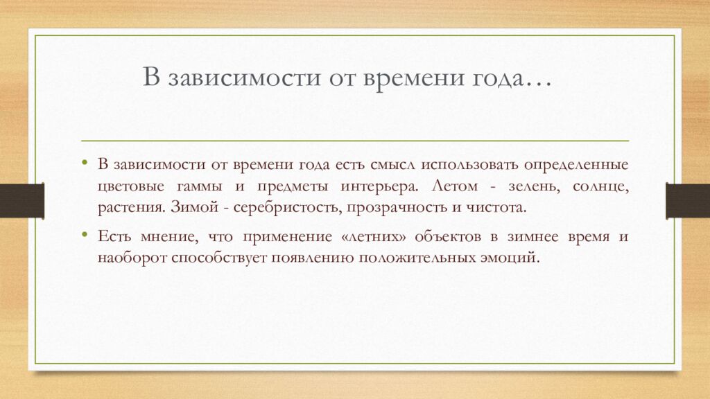 В зависимости от времени года есть смысл использовать определенные цветовые гаммы и предметы интерьера. Летом - зелень, солнце, растения. Зимой - серебристость, прозрачность и чистота. Есть мнение, что применение «летних» объектов в зимнее время и наоборот способствует появлению положительных эмоций. В зависимости от времени года…