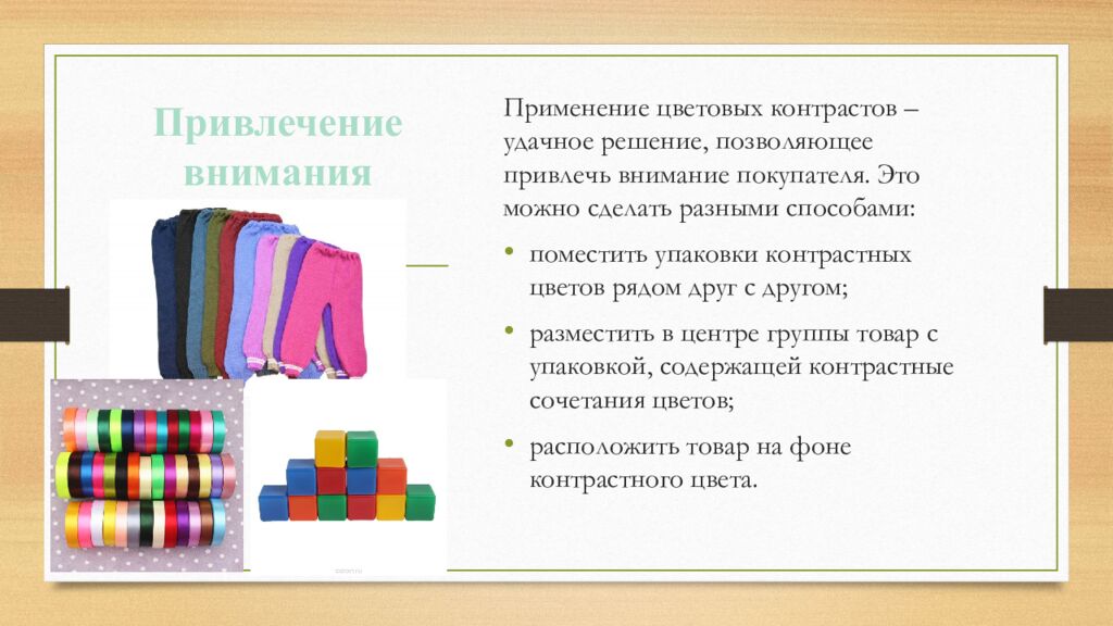 Применение цветовых контрастов – удачное решение, позволяющее привлечь внимание покупателя. Это можно сделать разными способами: поместить упаковки контрастных цветов рядом друг с другом; разместить в центре группы товар с упаковкой, содержащей контрастные сочетания цветов; расположить товар на фоне контрастного цвета. Привлечение внимания