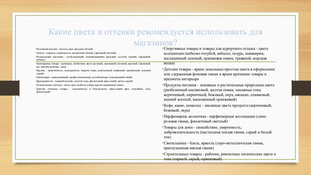 Молочный магазин - чистота, цвет продукта (белый) Аптека - порядок, стерильность, дисциплина (белый, сиреневый светлый) Музыкальные магазины - возбуждающий, запоминающийся (красный, золотой, черный, сиреневый, кобальт) Авангардные товары - кричащие, необычные цвета (розовый, оранжевый, лиловый, красный, сиреневый, все люминесцентные, хаки) Оружие - практичность, консерватизм, энергия (хаки, разбеленный оливковый, коричневый, зеленый, серый) Канцтовары - корпоративный, профессиональный, достойный цвет (насыщенный синий) Драгоценности - (кадмий желтый, золотой, охра, фиолетовый, ярко-синий, светло-серый) Отопительные системы - тепло, цвет свойства товара (красно-коричневая гамма) Дорогие стильные товары - изысканность и благородство (ярко-синий цвет, спокойные тона, фиолетовый) Спортивные товары и товары для курортного отдыха - цвета ассоциации (небесно-голубой, кобальт, лазурь, аквамарин, насыщенный зеленый, оранжевая гамма, травяной, морская волна) Детские товары - яркие локальные простые цвета в оформлении или сдержанная фоновая гамма и яркие кричащие товары и предметы интерьера Продукты питания - земляные и растительные природные цвета ( разбеленный малиновый, желтая гамма, земляные тона, коричневый, кирпичный, бежевый, охра, авокадо, оливковый, кадмий желтый, насыщенный оранжевый) Кофе, какао, шоколад - земляные цвета продукта (коричневый, бежевый, охра) Парфюмерия, косметика - парфюмерные ассоциации (сине-розовая гамма, фиолетовый светлый) Товары для дома - спокойствие, уверенность, доброжелательность (пастельная теплая гамма, серый и белый тон) Светильники - блеск, яркость (серо-металлическая гамма, приглушенная мягкая гамма) Строительные товары - рабочие, ремонтные технические цвета и тона (черный, серый, оранжевый)
