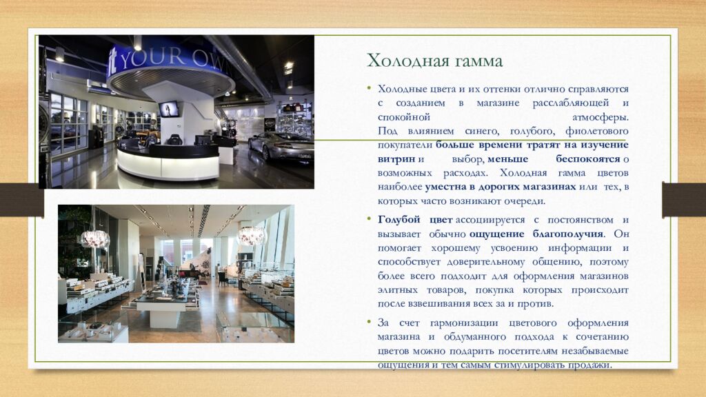 Холодная гамма Холодные цвета и их оттенки отлично справляются с созданием в магазине расслабляющей и спокойной атмосферы. Под влиянием синего, голубого, фиолетового покупатели больше времени тратят на изучение витрин и выбор, меньше беспокоятся о возможных расходах. Холодная гамма цветов наиболее уместна в дорогих магазинах или тех, в которых часто возникают очереди. Голубой цвет ассоциируется с постоянством и вызывает обычно ощущение благополучия. Он помогает хорошему усвоению информации и способствует доверительному общению, поэтому более всего подходит для оформления магазинов элитных товаров, покупка которых происходит после взвешивания всех за и против. За счет гармонизации цветового оформления магазина и обдуманного подхода к сочетанию цветов можно подарить посетителям незабываемые ощущения и тем самым стимулировать продажи.