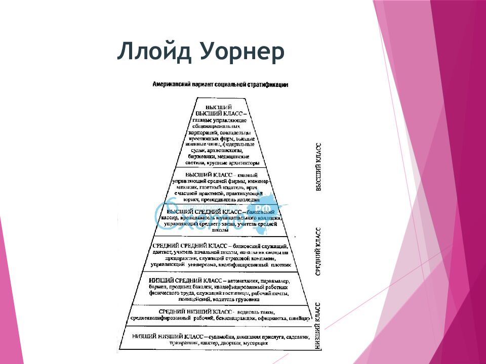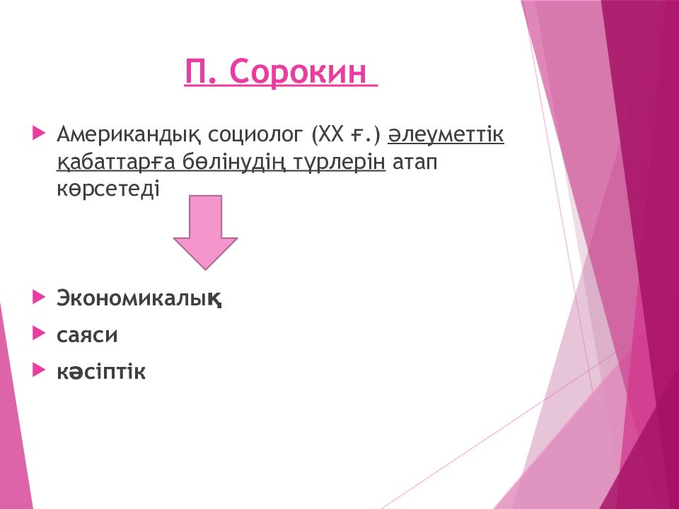 Американдық социолог (ХХ ғ.) әлеуметтік қабаттарға бөлінудің түрлерін атап көрсетеді Экономикалық саяси кәсіптік