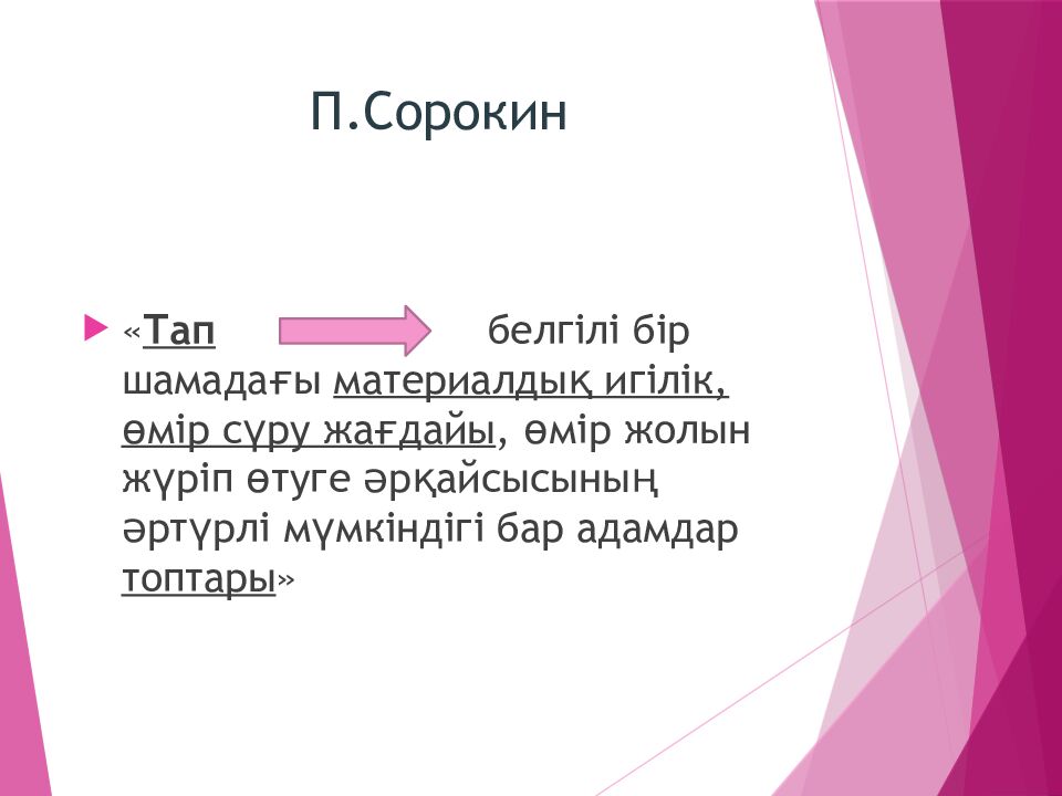 « Тап белгілі бір шамадағы материалдық игілік, өмір сүру жағдайы, өмір жолын жүріп өтуге әрқайсысының әртүрлі мүмкіндігі бар адамдар топтары »