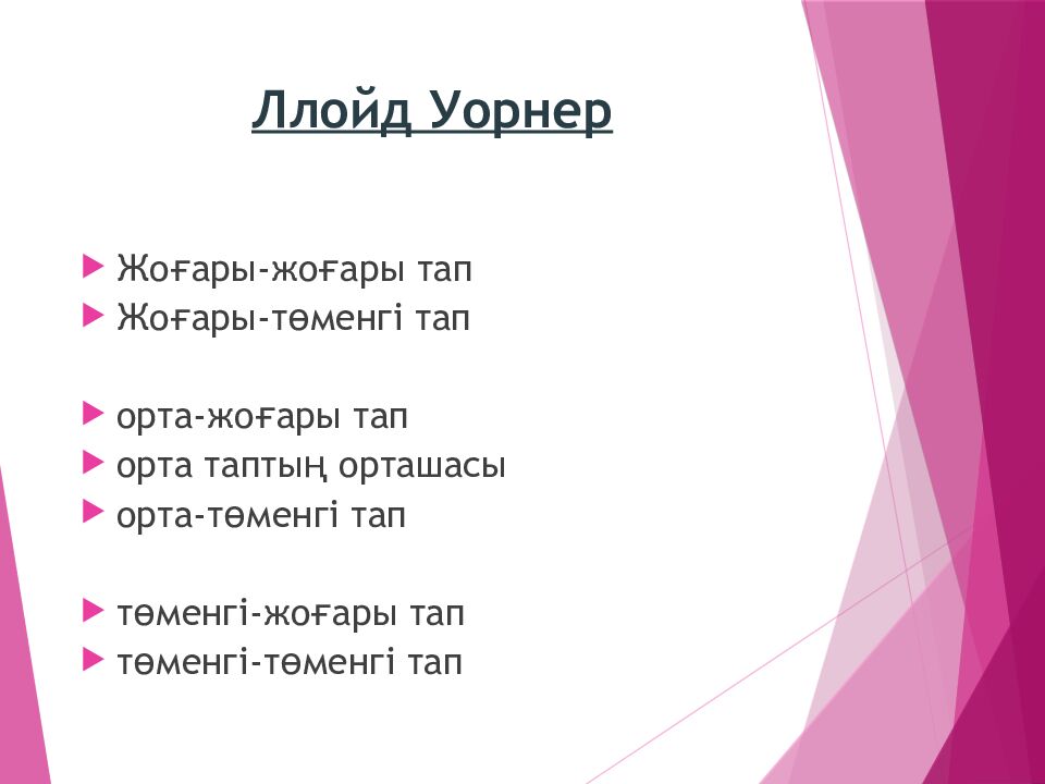 Жоғары-жоғары тап Жоғары-төменгі тап орта-жоғары тап орта таптың орташасы орта-төменгі тап төменгі-жоғары тап төменгі-төменгі тап