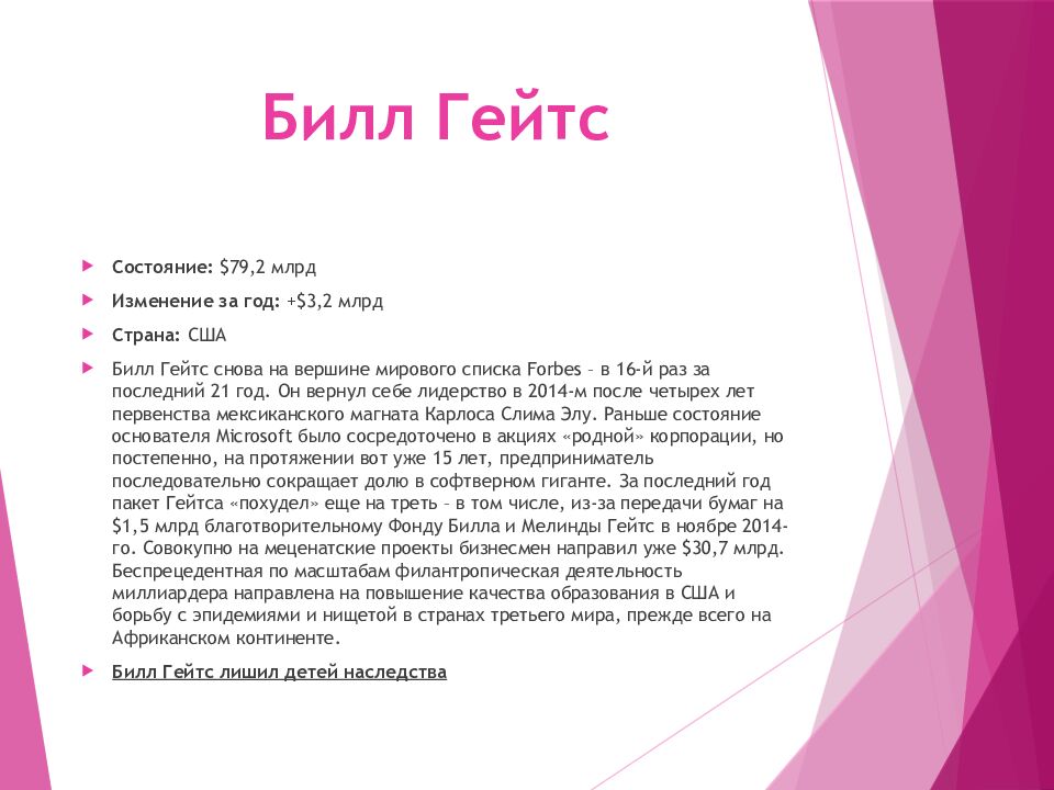 Состояние: $79,2 млрд Изменение за год: +$3,2 млрд Страна: США Билл Гейтс снова на вершине мирового списка Forbes – в 16-й раз за последний 21 год. Он вернул себе лидерство в 2014-м после четырех лет первенства мексиканского магната Карлоса Слима Элу. Раньше состояние основателя Microsoft было сосредоточено в акциях «родной» корпорации, но постепенно, на протяжении вот уже 15 лет, предприниматель последовательно сокращает долю в софтверном гиганте. За последний год пакет Гейтса «похудел» еще на треть – в том числе, из-за передачи бумаг на $1,5 млрд благотворительному Фонду Билла и Мелинды Гейтс в ноябре 2014-го. Совокупно на меценатские проекты бизнесмен направил уже $30,7 млрд. Беспрецедентная по масштабам филантропическая деятельность миллиардера направлена на повышение качества образования в США и борьбу с эпидемиями и нищетой в странах третьего мира, прежде всего на Африканском континенте. Билл Гейтс лишил детей наследства