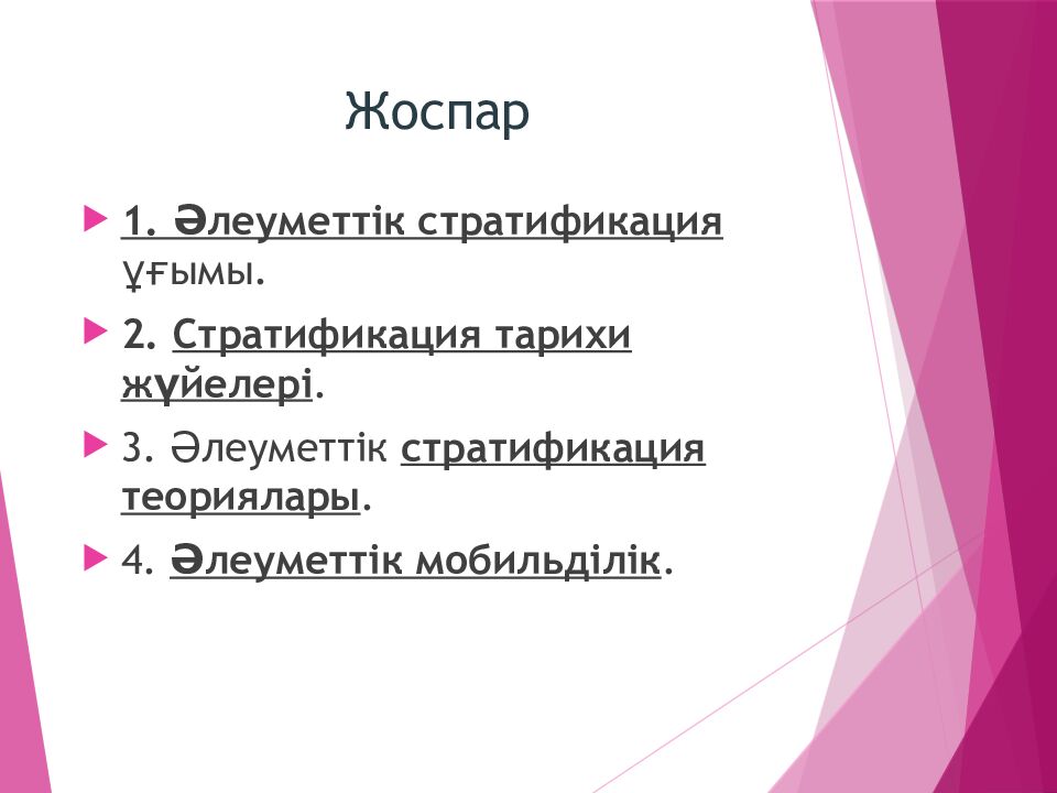 1. Әлеуметтік стратификация ұғымы. 2. Стратификация тарихи жүйелері. 3. Әлеуметтік стратификация теориялары. 4. Әлеуметтік мобильділік.