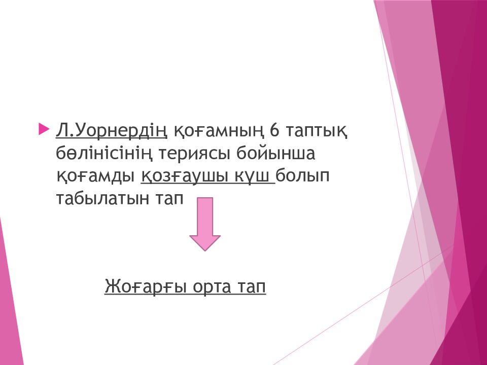 Л.Уорнердің қоғамның 6 таптық бөлінісінің териясы бойынша қоғамды қозғаушы күш болып табылатын тап Жоғарғы орта тап