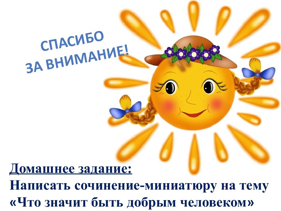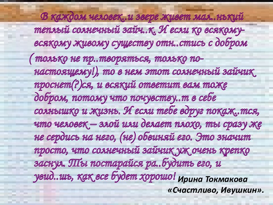 В каждом человек..и звере живет мал.. нький теплый солнечный зайч..к. И если ко всякому-всякому живому существу отн.. стись с добром ( только не пр.. творяться, только по-настоящему!), то в нем этот солнечный зайчик проснет (?) ся, и всякий ответит вам тоже добром, потому что почувству..т в себе солнышко и жизнь. И если тебе вдруг покаж.. тся, что человек – злой или делает плохо, ты сразу же не сердись на него, (не) обвиняй его. Это значит просто, что солнечный зайчик уж очень крепко заснул. Ты постарайся ра..будить его, и увид.. шь, как все будет хорошо! Ирина Токмакова «Счастливо, Ивушкин». (Слайд 16)