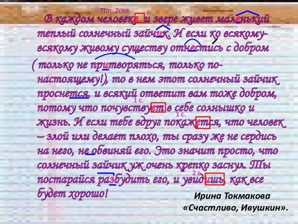 В каждом человек е и звере живет мал е нький теплый солнечный зайч и к. И если ко всякому-всякому живому существу отн е стись с добром ( только не пр и творяться, только по-настоящему!), то в нем этот солнечный зайчик проснется, и всякий ответит вам тоже добром, потому что почувству е т в себе солнышко и жизнь. И если тебе вдруг покаж е тся, что человек – злой или делает плохо, ты сразу же не сердись на него, не обвиняй его. Это значит просто, что солнечный зайчик уж очень крепко заснул. Ты постарайся ра з будить его, и увид и шь, как все будет хорошо! Ирина Токмакова «Счастливо, Ивушкин». (Слайд 16) 1 с. 1 с. 2 с. П.п. 2скл.