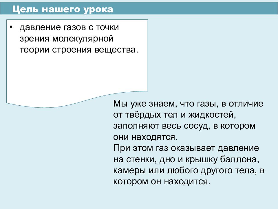 давление газов с точки зрения молекулярной теории строения вещества. Цель нашего урока Мы уже знаем, что газы, в отличие от твёрдых тел и жидкостей, заполняют весь сосуд, в котором они находятся. При этом газ оказывает давление на стенки, дно и крышку баллона, камеры или любого другого тела, в котором он находится.