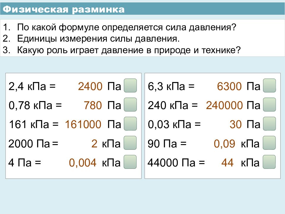Физическая разминка По какой формуле определяется сила давления? Единицы измерения силы давления. Какую роль играет давление в природе и технике? 2,4 кПа = 0,78 кПа = 161 кПа = 2000 Па = 4 Па = 2400 780 161000 2 0,004 6,3 кПа = 240 кПа = 0,03 кПа = 90 Па = 44000 Па = 6300 240000 30 0,09 44 Па Па Па Па Па Па кПа кПа кПа кПа