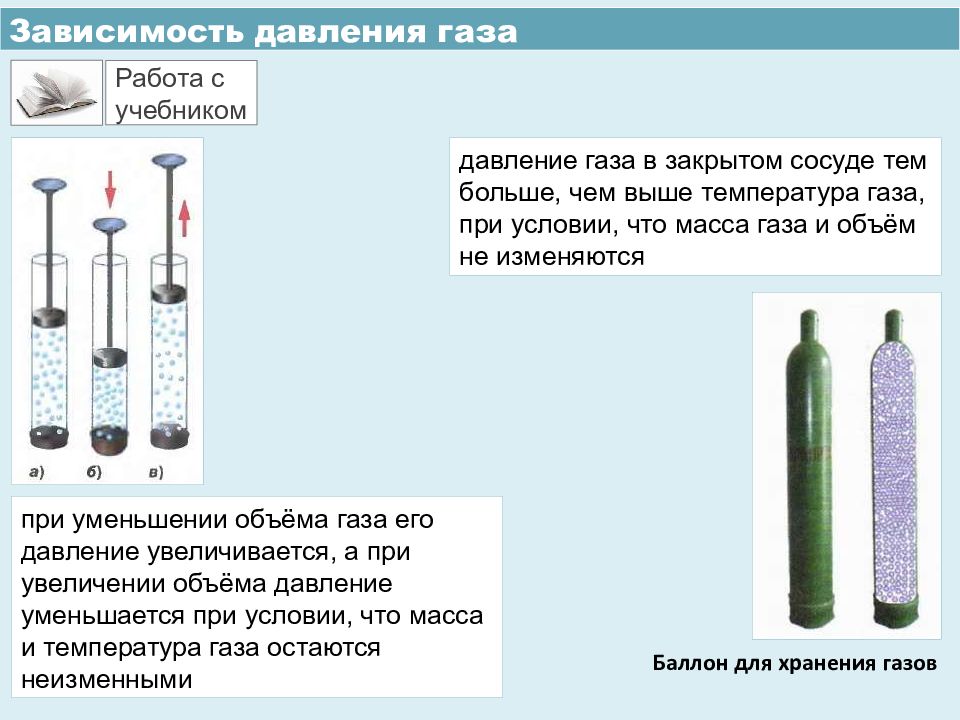 Зависимость давления газа Работа с учебником при уменьшении объёма газа его давление увеличивается, а при увеличении объёма давление уменьшается при условии, что масса и температура газа остаются неизменными давление газа в закрытом сосуде тем больше, чем выше температура газа, при условии, что масса газа и объём не изменяются Баллон для хранения газов