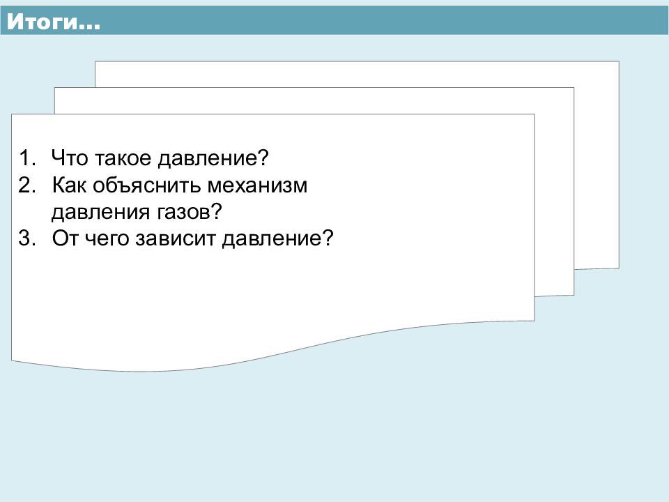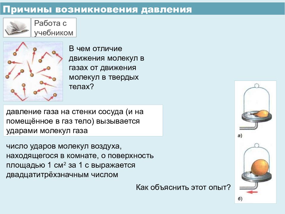 Причины возникновения давления В чем отличие движения молекул в газах от движения молекул в твердых телах? Работа с учебником давление газа на стенки сосуда (и на помещённое в газ тело) вызывается ударами молекул газа число ударов молекул воздуха, находящегося в комнате, о поверхность площадью 1 см 2 за 1 с выражается двадцатитрёхзначным числом Как объяснить этот опыт?