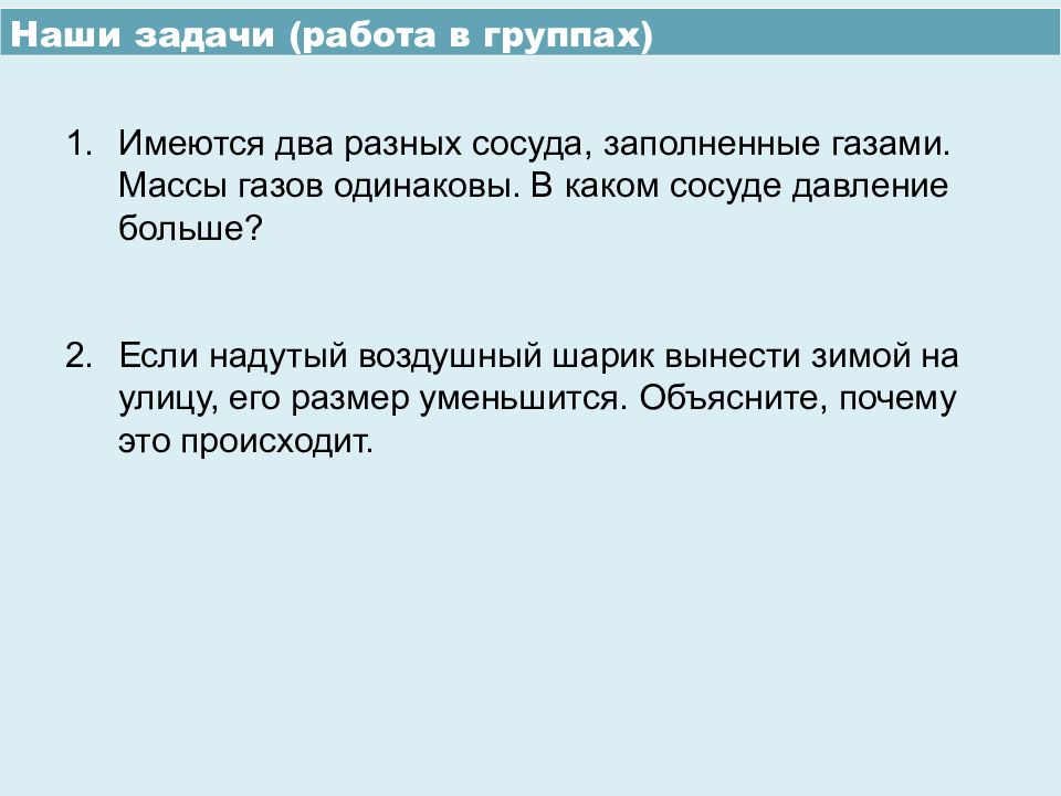 Наши задачи (работа в группах) Имеются два разных сосуда, заполненные газами. Массы газов одинаковы. В каком сосуде давление больше? Если надутый воздушный шарик вынести зимой на улицу, его размер уменьшится. Объясните, почему это происходит.