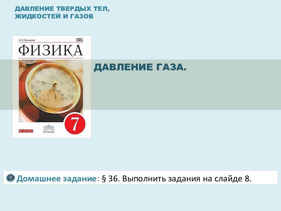 ДАВЛЕНИЕ ТВЕРДЫХ ТЕЛ, ЖИДКОСТЕЙ И ГАЗОВ ДАВЛЕНИЕ ГАЗА. Домашнее задание : § 36. Выполнить задания на слайде 8.