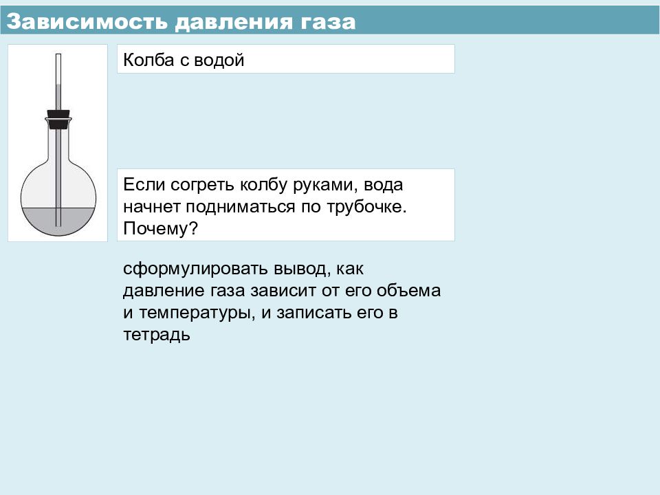 Зависимость давления газа Если согреть колбу руками, вода начнет подниматься по трубочке. Почему? Колба с водой сформулировать вывод, как давление газа зависит от его объема и температуры, и записать его в тетрадь