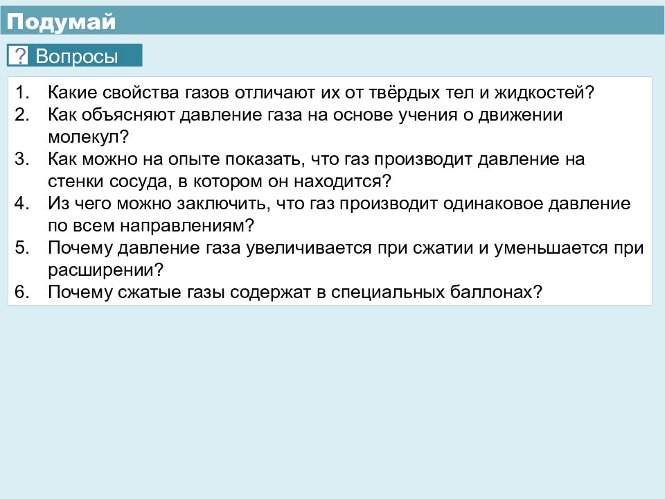 Подумай Какие свойства газов отличают их от твёрдых тел и жидкостей? Как объясняют давление газа на основе учения о движении молекул? Как можно на опыте показать, что газ производит давление на стенки сосуда, в котором он находится? Из чего можно заключить, что газ производит одинаковое давление по всем направлениям? Почему давление газа увеличивается при сжатии и уменьшается при расширении? Почему сжатые газы содержат в специальных баллонах? ? Вопросы