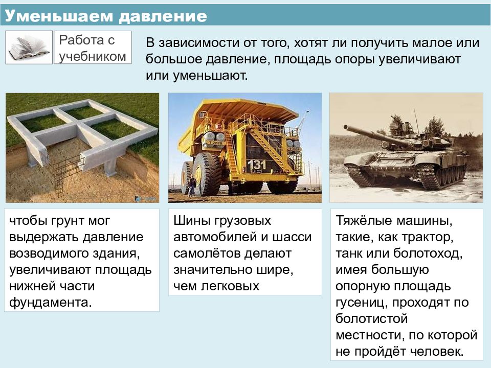 Уменьшаем давление В зависимости от того, хотят ли получить малое или большое давление, площадь опоры увеличивают или уменьшают. Работа с учебником чтобы грунт мог выдержать давление возводимого здания, увеличивают площадь нижней части фундамента. Шины грузовых автомобилей и шасси самолётов делают значительно шире, чем легковых Тяжёлые машины, такие, как трактор, танк или болотоход, имея большую опорную площадь гусениц, проходят по болотистой местности, по которой не пройдёт человек.