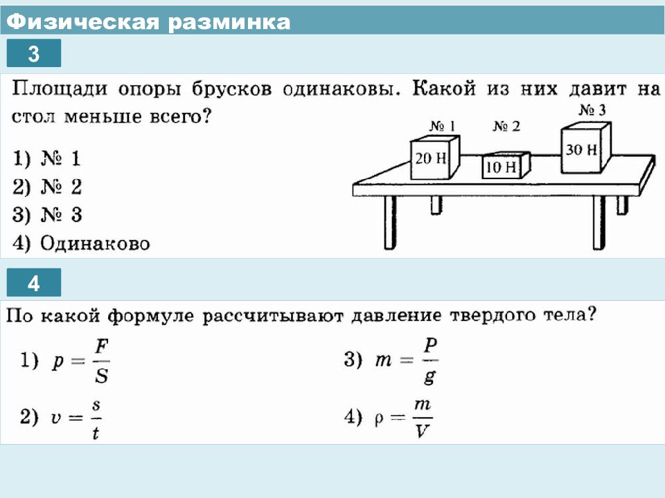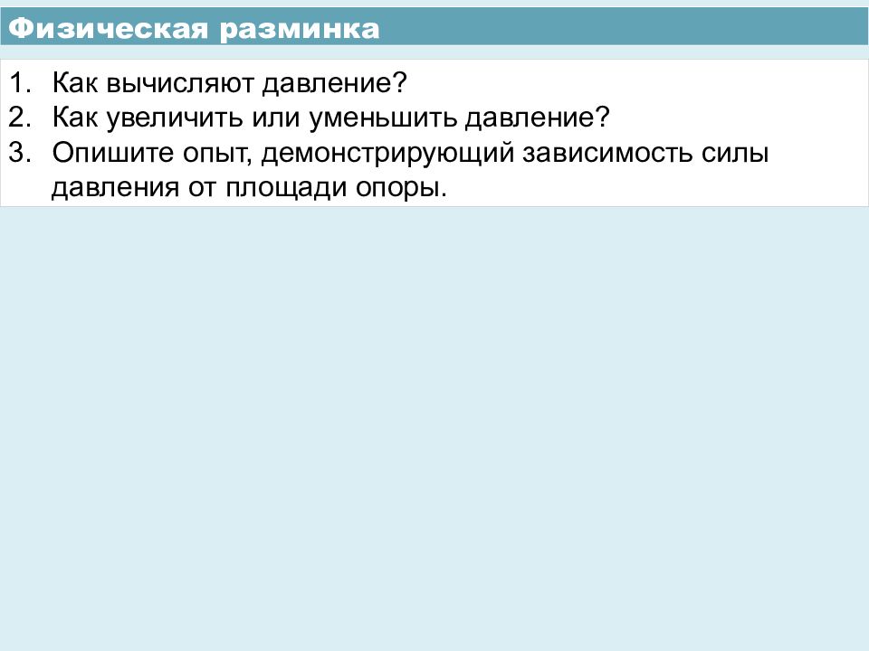 Физическая разминка Как вычисляют давление? Как увеличить или уменьшить давление? Опишите опыт, демонстрирующий зависимость силы давления от площади опоры.