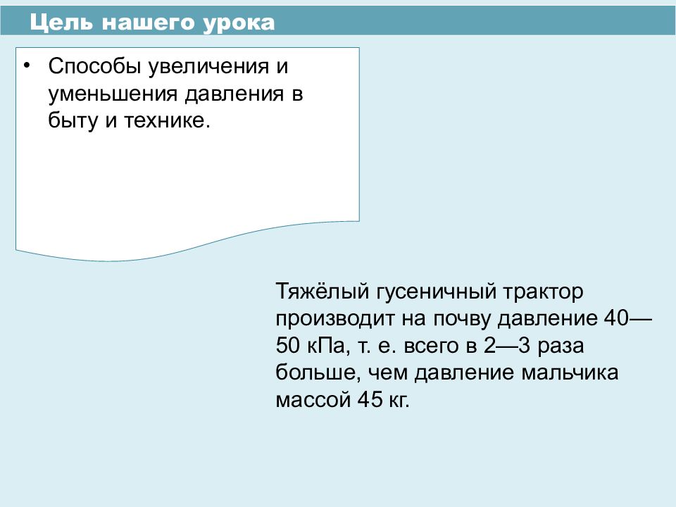 Способы увеличения и уменьшения давления в быту и технике. Цель нашего урока Тяжёлый гусеничный трактор производит на почву давление 40—50 кПа, т. е. всего в 2—3 раза больше, чем давление мальчика массой 45 кг.