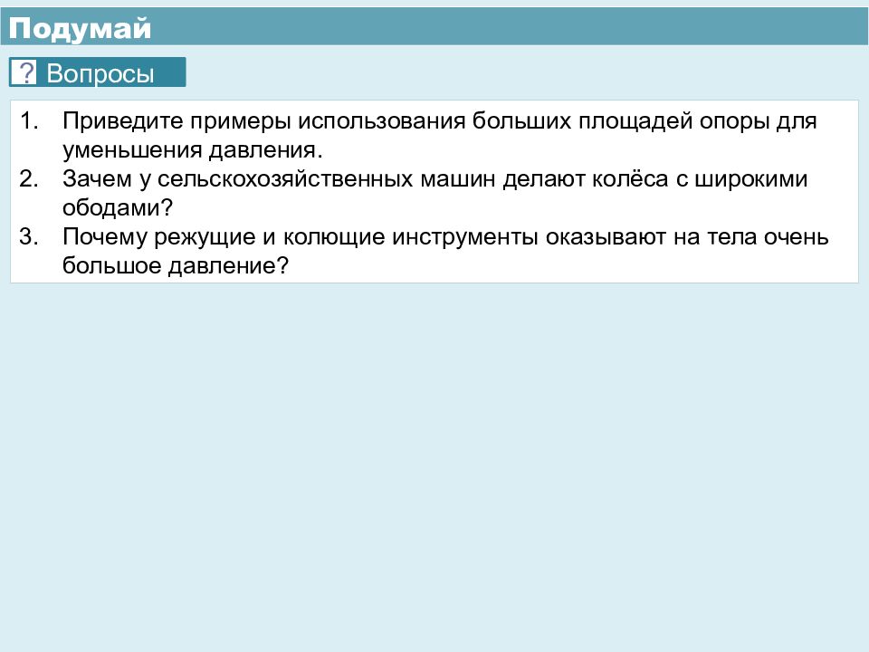 Подумай Приведите примеры использования больших площадей опоры для уменьшения давления. Зачем у сельскохозяйственных машин делают колёса с широкими ободами ? Почему режущие и колющие инструменты оказывают на тела очень большое давление? ? Вопросы