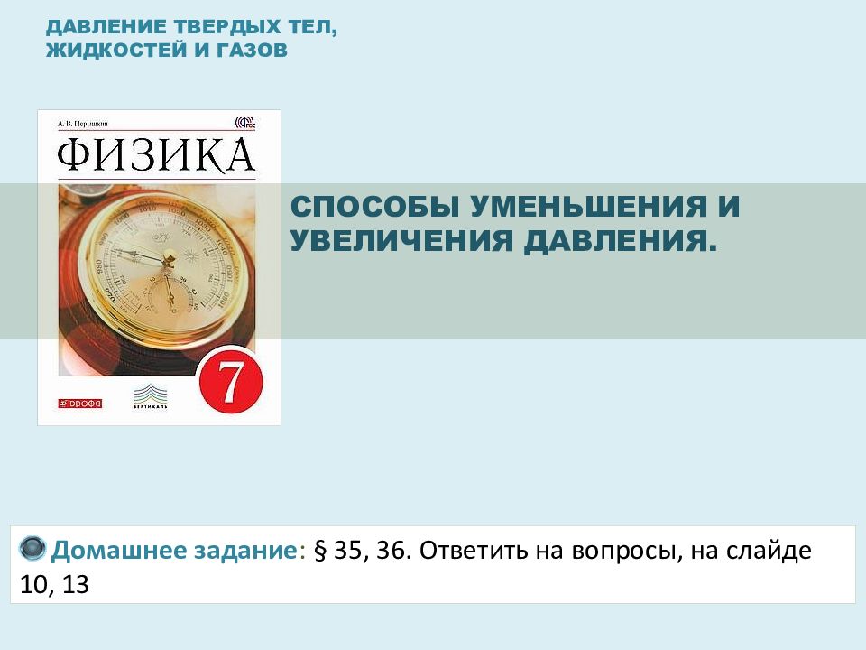 ДАВЛЕНИЕ ТВЕРДЫХ ТЕЛ, ЖИДКОСТЕЙ И ГАЗОВ СПОСОБЫ УМЕНЬШЕНИЯ И УВЕЛИЧЕНИЯ ДАВЛЕНИЯ. Домашнее задание : § 35, 36. Ответить на вопросы, на слайде 10, 13