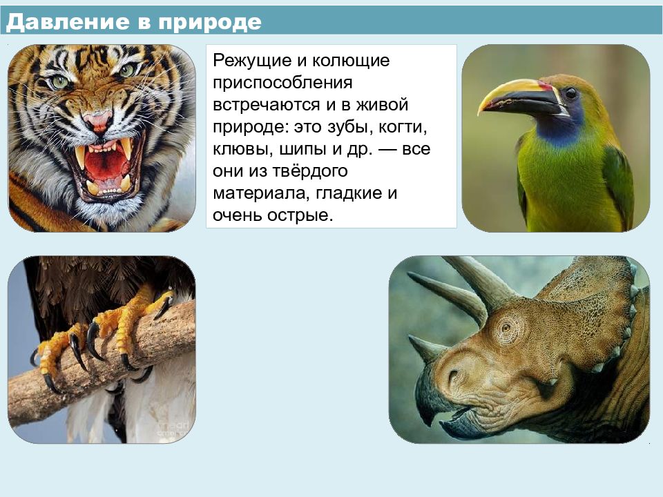 Давление в природе Режущие и колющие приспособления встречаются и в живой природе: это зубы, когти, клювы, шипы и др. — все они из твёрдого материала, гладкие и очень острые.