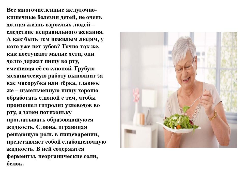 Все многочисленные желудочно- кишечные болезни детей, не очень долгая жизнь взрослых людей – следствие неправильного жевания. А как быть тем пожилым людям, у кого уже нет зубов? Точно так же, как поступают малые дети, они долго держат пищу во рту, смешивая её со слюной. Грубую механическую работу выполнит за вас мясорубка или тёрка, главное же – измельченную пищу хорошо обработать слюной с тем, чтобы произошел гидролиз углеводов во рту, а затем потихоньку проглатывать образовавшуюся жидкость. Слюна, играющая решающую роль в пищеварении, представляет собой слабощелочную жидкость. В ней содержатся ферменты, неорганические соли, белок.