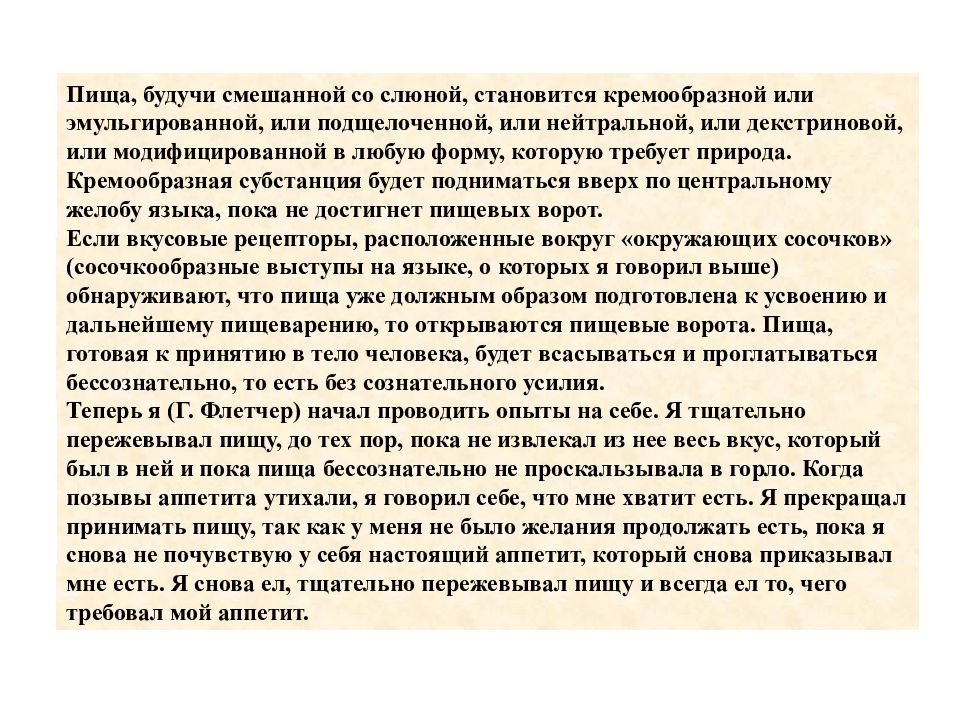 Пища, будучи смешанной со слюной, становится кремообразной или эмульгированной, или подщелоченной, или нейтральной, или декстриновой, или модифицированной в любую форму, которую требует природа. Кремообразная субстанция будет подниматься вверх по центральному желобу языка, пока не достигнет пищевых ворот. Если вкусовые рецепторы, расположенные вокруг «окружающих сосочков» ( сосочкообразные выступы на языке, о которых я говорил выше) обнаруживают, что пища уже должным образом подготовлена к усвоению и дальнейшему пищеварению, то открываются пищевые ворота. Пища, готовая к принятию в тело человека, будет всасываться и проглатываться бессознательно, то есть без сознательного усилия. Теперь я ( Г. Флетчер ) начал проводить опыты на себе. Я тщательно пережевывал пищу, до тех пор, пока не извлекал из нее весь вкус, который был в ней и пока пища бессознательно не проскальзывала в горло. Когда позывы аппетита утихали, я говорил себе, что мне хватит есть. Я прекращал принимать пищу, так как у меня не было желания продолжать есть, пока я снова не почувствую у себя настоящий аппетит, который снова приказывал мне есть. Я снова ел, тщательно пережевывал пищу и всегда ел то, чего требовал мой аппетит.