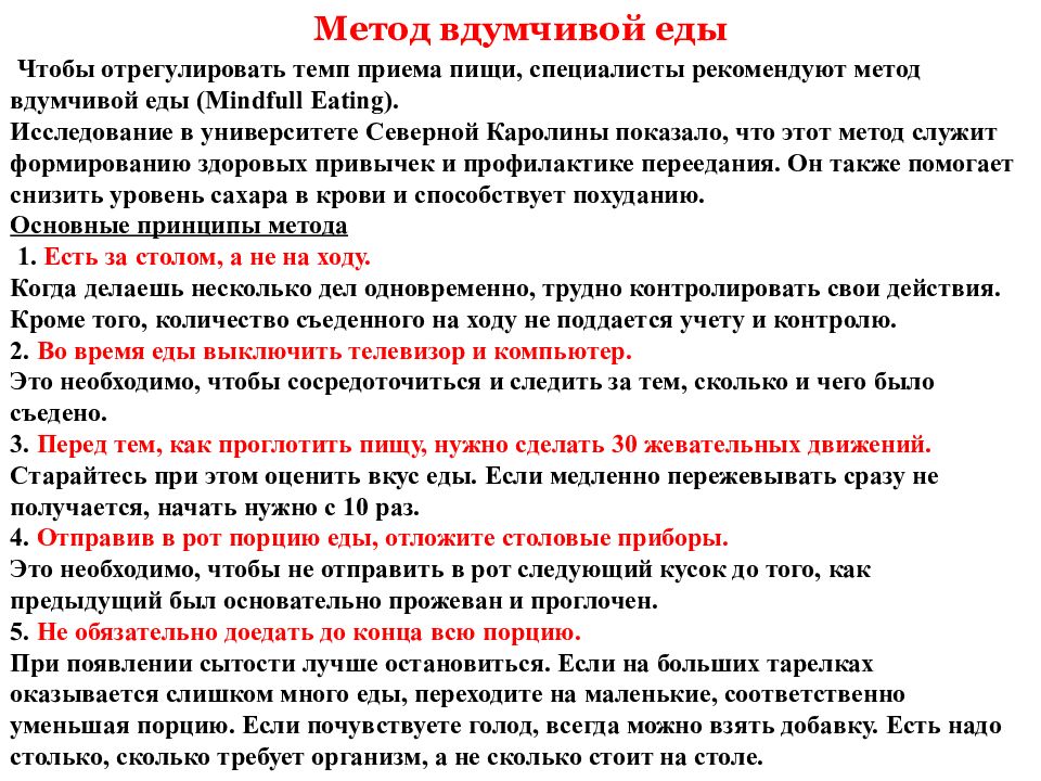 Чтобы отрегулировать темп приема пищи, специалисты рекомендуют метод вдумчивой еды ( Mindfull Eating ). Исследование в университете Северной Каролины показало, что этот метод служит формированию здоровых привычек и профилактике переедания. Он также помогает снизить уровень сахара в крови и способствует похуданию. Основные принципы метода 1. Есть за столом, а не на ходу. Когда делаешь несколько дел одновременно, трудно контролировать свои действия. Кроме того, количество съеденного на ходу не поддается учету и контролю. 2. Во время еды выключить телевизор и компьютер. Это необходимо, чтобы сосредоточиться и следить за тем, сколько и чего было съедено. 3. Перед тем, как проглотить пищу, нужно сделать 30 жевательных движений. Старайтесь при этом оценить вкус еды. Если медленно пережевывать сразу не получается, начать нужно с 10 раз. 4. Отправив в рот порцию еды, отложите столовые приборы. Это необходимо, чтобы не отправить в рот следующий кусок до того, как предыдущий был основательно прожеван и проглочен. 5. Не обязательно доедать до конца всю порцию. При появлении сытости лучше остановиться. Если на больших тарелках оказывается слишком много еды, переходите на маленькие, соответственно уменьшая порцию. Если почувствуете голод, всегда можно взять добавку. Есть надо столько, сколько требует организм, а не сколько стоит на столе. Метод вдумчивой еды