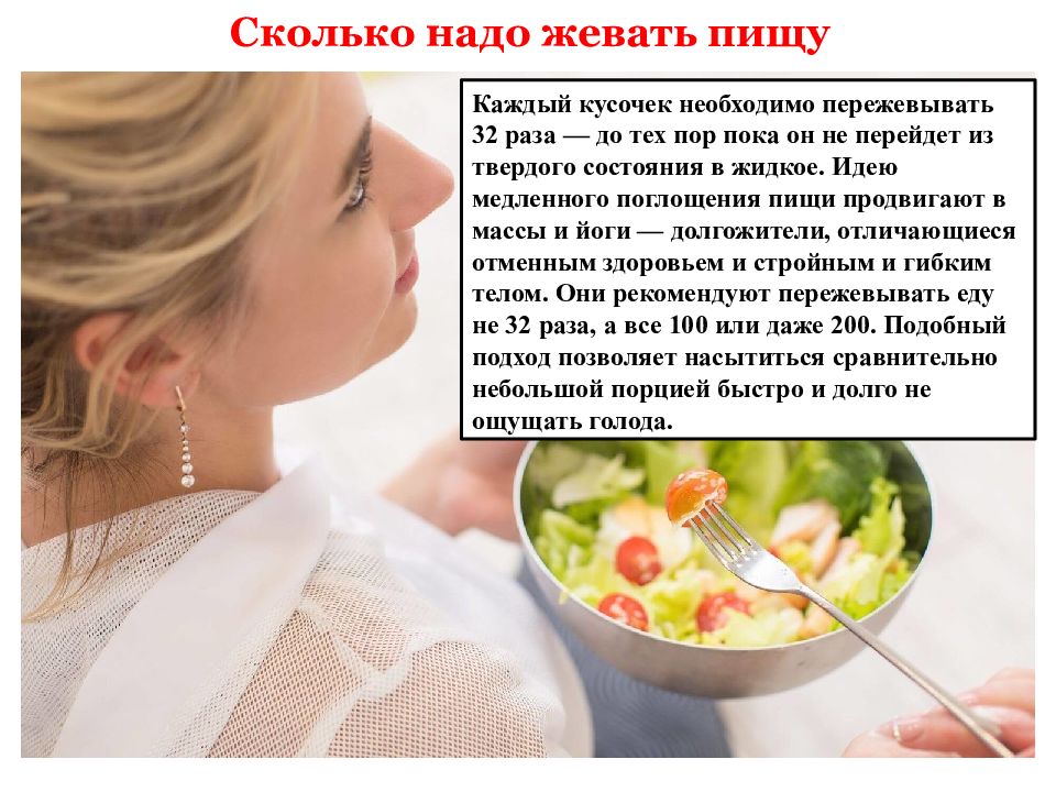 Сколько надо жевать пищу Каждый кусочек необходимо пережевывать 32 раза — до тех пор пока он не перейдет из твердого состояния в жидкое. Идею медленного поглощения пищи продвигают в массы и йоги — долгожители, отличающиеся отменным здоровьем и стройным и гибким телом. Они рекомендуют пережевывать еду не 32 раза, а все 100 или даже 200. Подобный подход позволяет насытиться сравнительно небольшой порцией быстро и долго не ощущать голода.