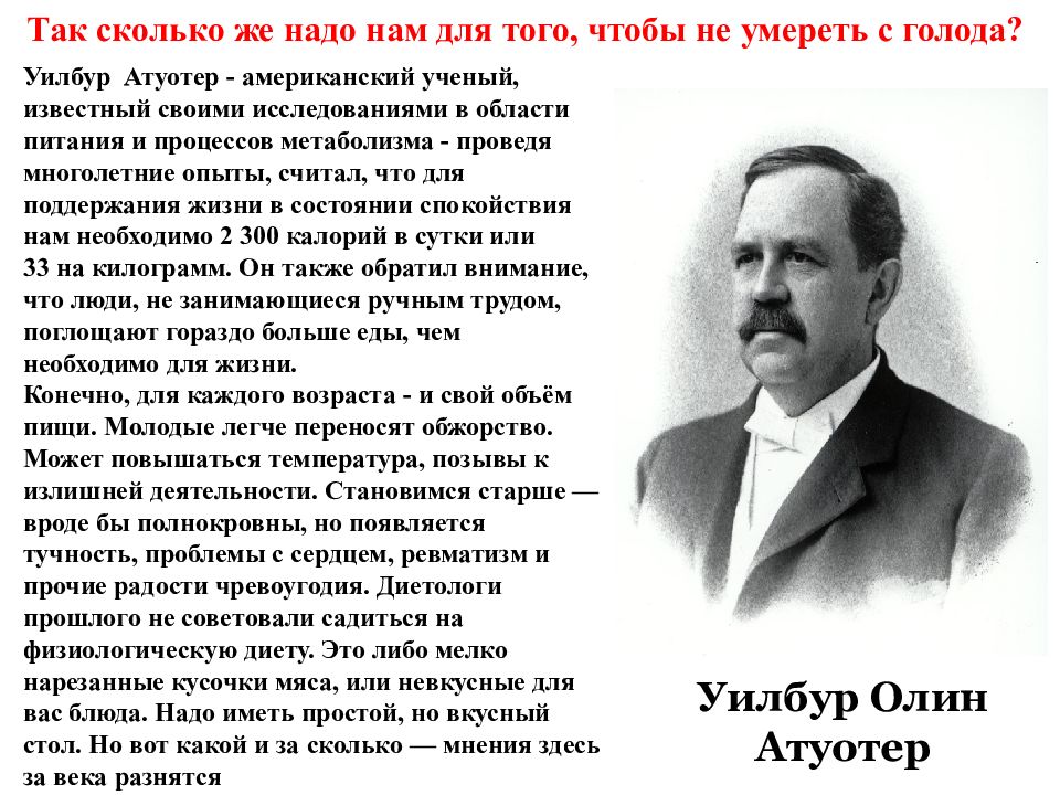 Уилбур Атуотер - американский ученый, известный своими исследованиями в области питания и процессов метаболизма - проведя многолетние опыты, считал, что для поддержания жизни в состоянии спокойствия нам необходимо 2 300 калорий в сутки или 33 на килограмм. Он также обратил внимание, что люди, не занимающиеся ручным трудом, поглощают гораздо больше еды, чем необходимо для жизни. Конечно, для каждого возраста - и свой объём пищи. Молодые легче переносят обжорство. Может повышаться температура, позывы к излишней деятельности. Становимся старше — вроде бы полнокровны, но появляется тучность, проблемы с сердцем, ревматизм и прочие радости чревоугодия. Диетологи прошлого не советовали садиться на физиологическую диету. Это либо мелко нарезанные кусочки мяса, или невкусные для вас блюда. Надо иметь простой, но вкусный стол. Но вот какой и за сколько — мнения здесь за века разнятся Уилбур Олин Атуотер Так сколько же надо нам для того, чтобы не умереть с голода?