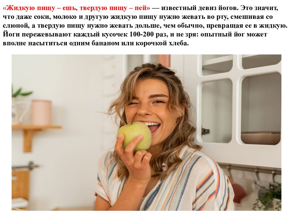 « Жидкую пищу – ешь, твердую пищу – пей» — известный девиз йогов. Это значит, что даже соки, молоко и другую жидкую пищу нужно жевать во рту, смешивая со слюной, а твердую пищу нужно жевать дольше, чем обычно, превращая ее в жидкую. Йоги пережевывают каждый кусочек 100-200 раз, и не зря: опытный йог может вполне насытиться одним бананом или корочкой хлеба.