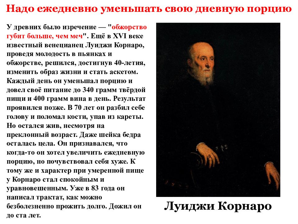 У древних было изречение — " обжорство губит больше, чем меч ". Ещё в XVI веке известный венецианец Луиджи Корнаро, проведя молодость в пьянках и обжорстве, решился, достигнув 40-летия, изменить образ жизни и стать аскетом. Каждый день он уменьшал порцию и довел своё питание до 340 грамм твёрдой пищи и 400 грамм вина в день. Результат проявился позже. В 70 лет он разбил себе голову и поломал кости, упав из кареты. Но остался жив, несмотря на преклонный возраст. Даже шейка бедра осталась цела. Он признавался, что когда-то он хотел увеличить ежедневную порцию, но почувствовал себя хуже. К тому же и характер при умеренной пище у Корнаро стал спокойным и уравновешенным. Уже в 83 года он написал трактат, как можно безболезненно прожить долго. Дожил он до ста лет. Луиджи Корнаро Надо ежедневно уменьшать свою дневную порцию