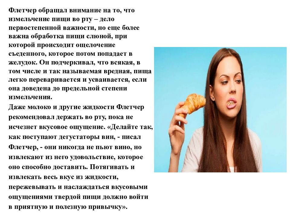 Флетчер обращал внимание на то, что измельчение пищи во рту – дело первостепенной важности, но еще более важна обработка пищи слюной, при которой происходит ощелочение съеденного, которое потом попадает в желудок. Он подчеркивал, что всякая, в том числе и так называемая вредная, пища легко переваривается и усваивается, если она доведена до предельной степени измельчения. Даже молоко и другие жидкости Флетчер рекомендовал держать во рту, пока не исчезнет вкусовое ощущение. «Делайте так, как поступают дегустаторы вин, - писал Флетчер, - они никогда не пьют вино, но извлекают из него удовольствие, которое оно способно доставить. Потягивать и извлекать весь вкус из жидкости, пережевывать и наслаждаться вкусовыми ощущениями твердой пищи должно войти в приятную и полезную привычку».