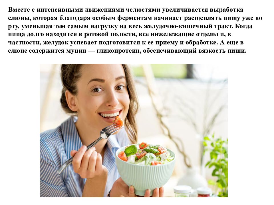 Вместе с интенсивными движениями челюстями увеличивается выработка слюны, которая благодаря особым ферментам начинает расщеплять пищу уже во рту, уменьшая тем самым нагрузку на весь желудочно-кишечный тракт. Когда пища долго находится в ротовой полости, все нижележащие отделы и, в частности, желудок успевает подготовится к ее приему и обработке. А еще в слюне содержится муцин — гликопротеин, обеспечивающий вязкость пищи.