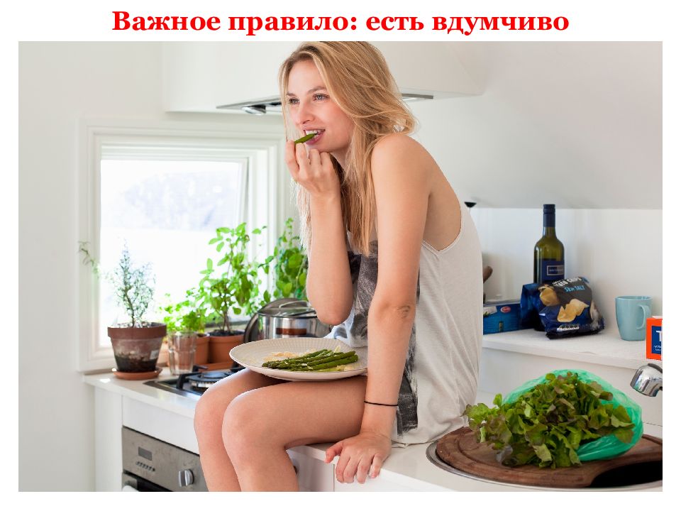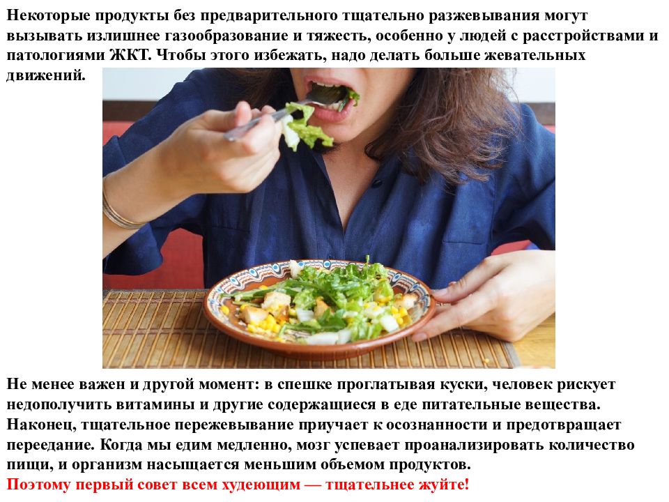 Некоторые продукты без предварительного тщательно разжевывания могут вызывать излишнее газообразование и тяжесть, особенно у людей с расстройствами и патологиями ЖКТ. Чтобы этого избежать, надо делать больше жевательных движений. Не менее важен и другой момент: в спешке проглатывая куски, человек рискует недополучить витамины и другие содержащиеся в еде питательные вещества. Наконец, тщательное пережевывание приучает к осознанности и предотвращает переедание. Когда мы едим медленно, мозг успевает проанализировать количество пищи, и организм насыщается меньшим объемом продуктов. Поэтому первый совет всем худеющим — тщательнее жуйте!