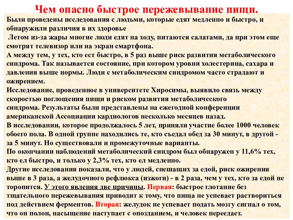 Были проведены исследования с людьми, которые едят медленно и быстро, и обнаружили различия в их здоровье Летом из-за жары многие люди едят на ходу, питаются салатами, да при этом еще смотрят телевизор или на экран смартфона. А между тем, у тех, кто ест быстро, в 5 раз выше риск развития метаболического синдрома. Так называется состояние, при котором уровни холестерина, сахара и давления выше нормы. Люди с метаболическим синдромом часто страдают и ожирением. Исследование, проведенное в университете Хиросимы, выявило связь между скоростью поглощения пищи и риском развития метаболического синдрома. Результаты были представлены на ежегодной конференции американской Ассоциации кардиологов несколько месяцев назад. В исследовании, которое продолжалось 5 лет, приняли участие более 1000 человек обоего пола. В одной группе находились те, кто съедал обед за 30 минут, в другой - за 5 минут. Но существовали и промежуточные варианты. По окончании наблюдений метаболический синдром был обнаружен у 11,6% тех, кто ел быстро, и только у 2,3% тех, кто ел медленно. Другие исследования показали, что у людей, спешащих за едой, риск ожирения выше в 3 раза, а желудочного рефлюкса (изжоги) - в 2 раза, чем у тех, кто за едой не торопится. У этого явления две причины. Первая : быстрое глотание без тщательного пережевывания приводит к тому, что пища не успевает раствориться под действием ферментов. Вторая : желудок не успевает подать мозгу сигнал о том, что он полон, насыщение наступает с опозданием, и человек переедает. Чем опасно быстрое пережевывание пищи.