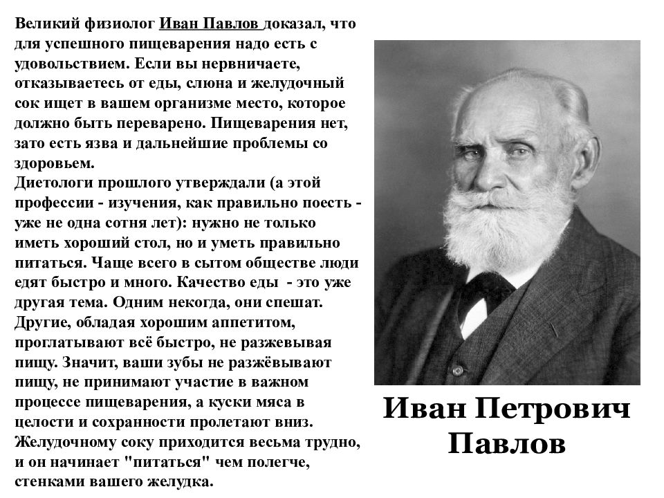 Великий физиолог Иван Павлов доказал, что для успешного пищеварения надо есть с удовольствием. Если вы нервничаете, отказываетесь от еды, слюна и желудочный сок ищет в вашем организме место, которое должно быть переварено. Пищеварения нет, зато есть язва и дальнейшие проблемы со здоровьем. Диетологи прошлого утверждали (а этой профессии - изучения, как правильно поесть - уже не одна сотня лет): нужно не только иметь хороший стол, но и уметь правильно питаться. Чаще всего в сытом обществе люди едят быстро и много. Качество еды - это уже другая тема. Одним некогда, они спешат. Другие, обладая хорошим аппетитом, проглатывают всё быстро, не разжевывая пищу. Значит, ваши зубы не разжёвывают пищу, не принимают участие в важном процессе пищеварения, а куски мяса в целости и сохранности пролетают вниз. Желудочному соку приходится весьма трудно, и он начинает "питаться" чем полегче, стенками вашего желудка. Иван Петрович Павлов