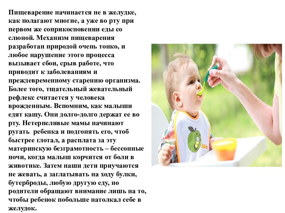 Пищеварение начинается не в желудке, как полагают многие, а уже во рту при первом же соприкосновении еды со слюной. Механизм пищеварения разработан природой очень тонко, и любое нарушение этого процесса вызывает сбои, срыв работе, что приводит к заболеваниям и преждевременному старению организма. Более того, тщательный жевательный рефлекс считается у человека врожденным. Вспомним, как малыши едят кашу. Они долго-долго держат ее во рту. Нетерпеливые мамы начинают ругать ребенка и подгонять его, чтоб быстрее глотал, а расплата за эту материнскую безграмотность – бессонные ночи, когда малыш корчится от боли в животике. Затем наши дети приучаются не жевать, а заглатывать на ходу булки, бутерброды, любую другую еду, но родители обращают внимание лишь на то, чтобы ребенок побольше натолкал себе в желудок.