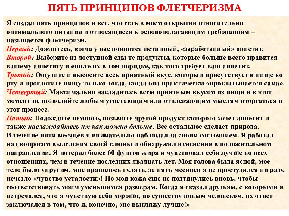 Я создал пять принципов и все, что есть в моем открытии относительно оптимального питания и относящиеся к основополагающим требованиям – называется флетчеризм. Первый : Дождитесь, когда у вас появится истинный, «заработанный» аппетит. Второй : Выберите из доступной еды те продукты, которые больше всего нравится вашему аппетиту и ешьте их в том порядке, как того требует ваш аппетит. Третий : Ощутите и высосите весь приятный вкус, который присутствует в пище во рту и проглотите пищу только тогда, когда она практически «проглатывается сама». Четвертый : Максимально насладитесь всем приятным вкусом из пищи и в этот момент не позволяйте любым угнетающим или отвлекающим мыслям вторгаться в этот процесс. Пятый : Подождите немного, возьмите другой продукт которого хочет аппетит и также наслаждайтесь им как можно больше. Все остальное сделает природа. В течение пяти месяцев я внимательно наблюдал за своим состоянием. Я работал над вопросом выделения своей слюны и обнаружил изменения в положительном направлении. Я потерял более 60 фунтов жира и чувствовал себя лучше во всех отношениях, чем в течение последних двадцать лет. Моя голова была ясной, мое тело было упругим, мне нравилось гулять, за пять месяцев я не простудился ни разу, исчезло «чувство усталости»! Но моя кожа еще не подтянулись вновь, чтобы соответствовать моим уменьшимся размерам. Когда я сказал друзьям, с которыми я встречался, что я чувствую себя хорошо, по существу новым человеком, их ответ заключался в том, что я, конечно, «не выгляжу лучше!» ПЯТЬ ПРИНЦИПОВ ФЛЕТЧЕРИЗМА