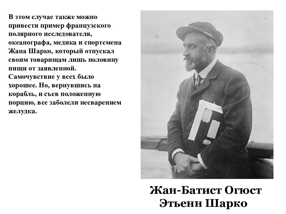 В этом случае также можно привести пример французского полярного исследователя, океанографа, медика и спортсмена Жана Шарко, который отпускал своим товарищам лишь половину пищи от заявленной. Самочувствие у всех было хорошее. Но, вернувшись на корабль, и съев положенную порцию, все заболели несварением желудка. Жан-Батист Огюст Этьенн Шарко