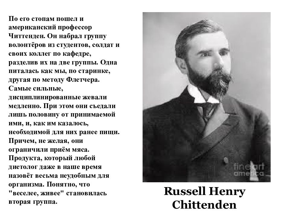 По его стопам пошел и американский профессор Читтенден. Он набрал группу волонтёров из студентов, солдат и своих коллег по кафедре, разделив их на две группы. Одна питалась как мы, по старинке, другая по методу Флетчера. Самые сильные, дисциплинированные жевали медленно. При этом они съедали лишь половину от принимаемой ими, и, как им казалось, необходимой для них ранее пищи. Причем, не желая, они ограничили приём мяса. Продукта, который любой диетолог даже в наше время назовёт весьма неудобным для организма. Понятно, что "веселее, живее" становилась вторая группа. Russell Henry Chittenden