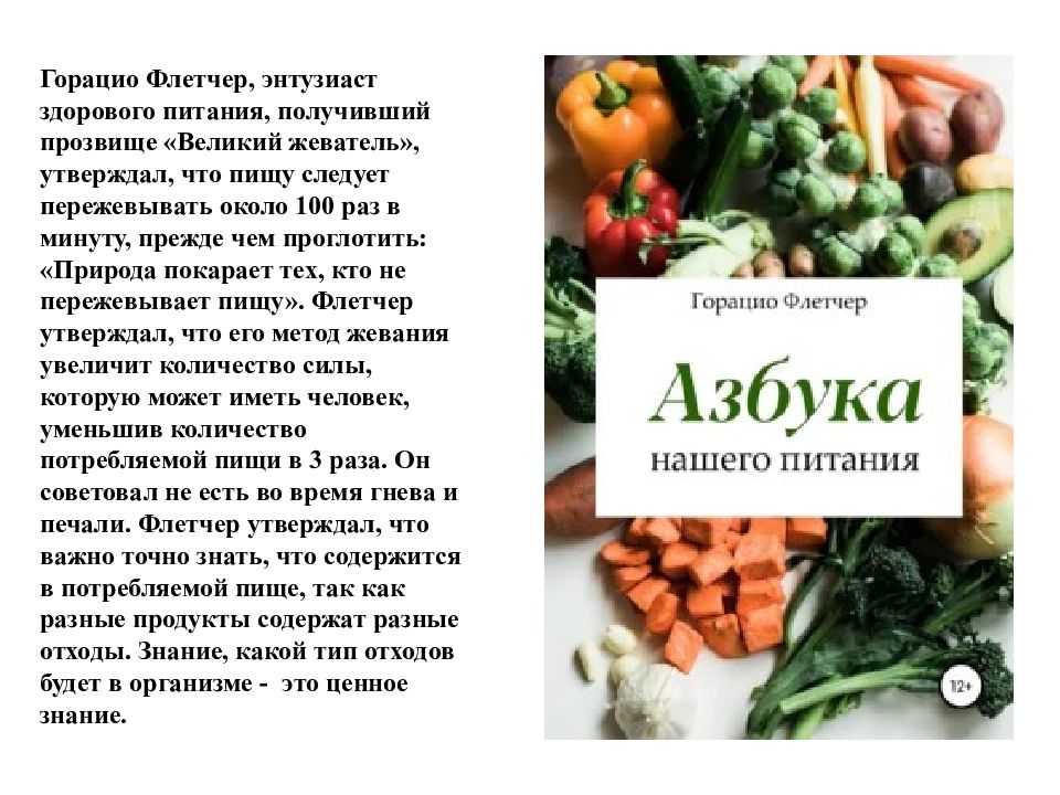 Давно известно, что все новое – хорошо забытое старое. Еще пять тысяч лет назад ведическая культура востока предписывала длительное – до ста раз – пережевывание пищи, а русская народная поговорка донесла до наших дней вековую мудрость: « Кто долго жует, тот долго живет ». В 1915г. в Петербурге вышла книга итальянского ученого Г. Флетчера «Азбука питания». В своих разработках Флетчер опирался на работы российского физиолога И. Павлова. Проведя серию экспериментов в клинике Европы и Америки, Флетчер пришел к выводу, что самый верный и надежный способ достижения здоровья и долголетия – тщательное пережевывание пищи и умеренность в еде. Горацио Флетчер