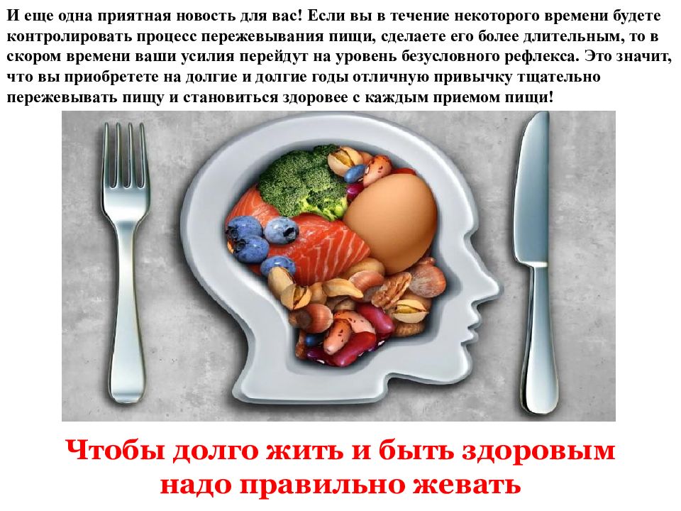 Чтобы долго жить и быть здоровым надо правильно жевать И еще одна приятная новость для вас! Если вы в течение некоторого времени будете контролировать процесс пережевывания пищи, сделаете его более длительным, то в скором времени ваши усилия перейдут на уровень безусловного рефлекса. Это значит, что вы приобретете на долгие и долгие годы отличную привычку тщательно пережевывать пищу и становиться здоровее с каждым приемом пищи!